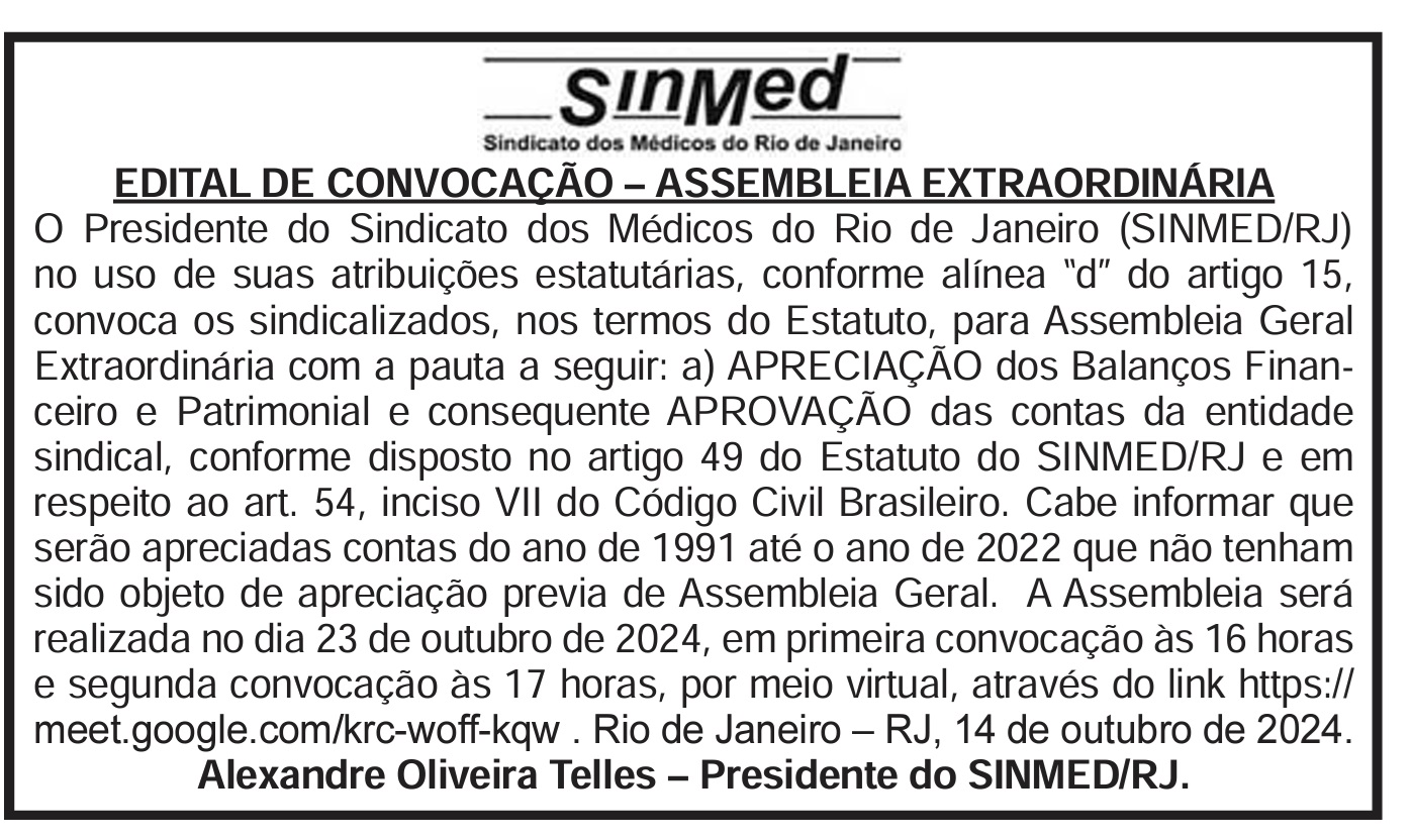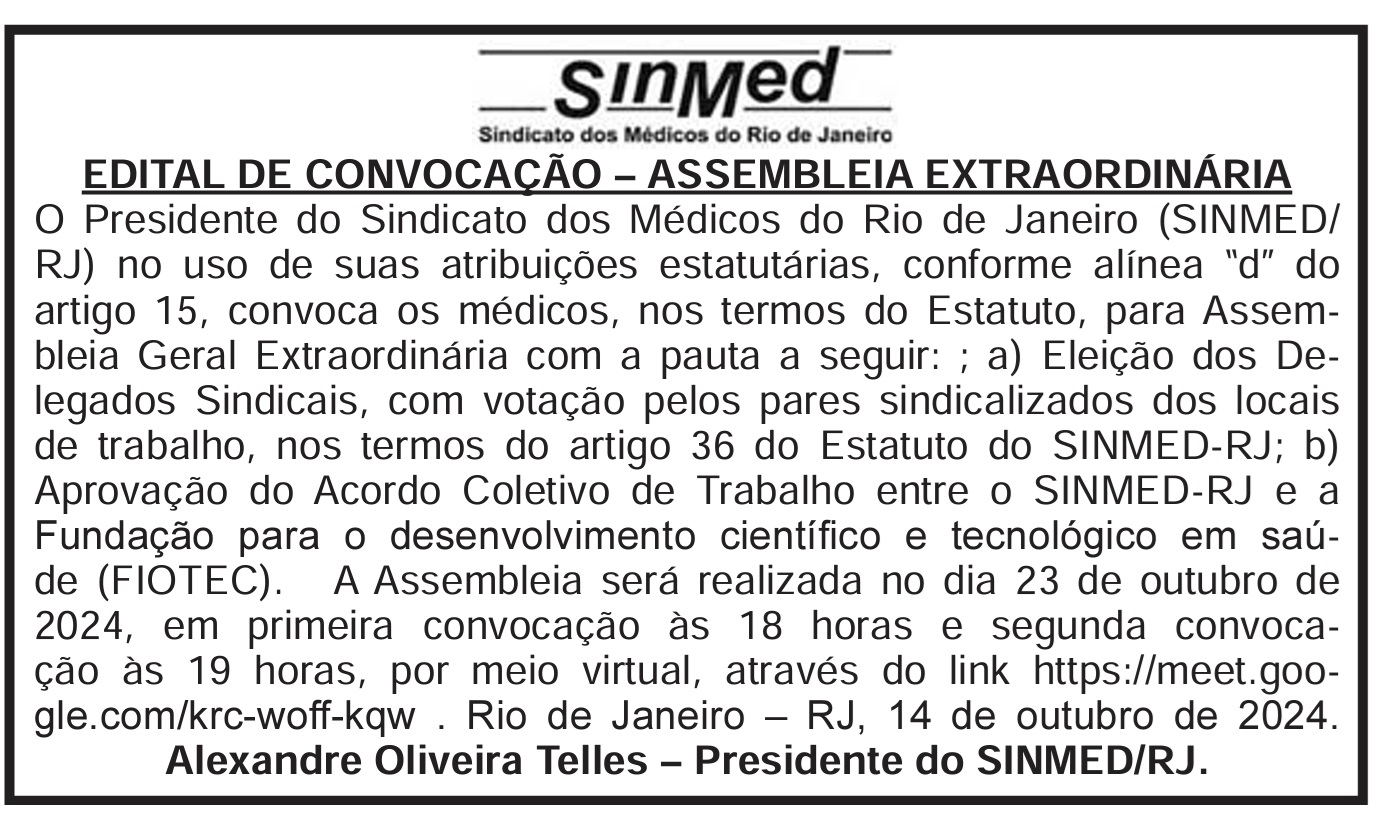 Assembleia Geral do SINMED (Serão duas assembleias gerais no mesmo dia, cada um com o devido edital)