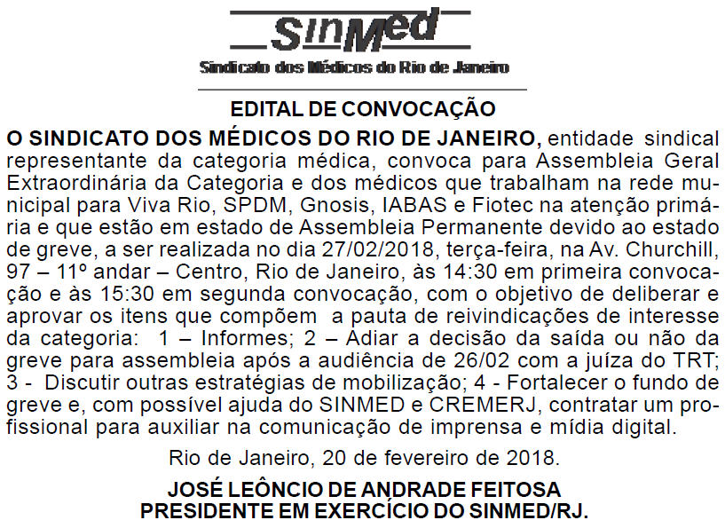 O SINDICATO DOS MÉDICOS DO RIO DE JANEIRO, entidade sindical representante da categoria médica, convoca para Assembleia Geral Extraordinária da Categoria e dos médicos que trabalham na rede municipal para Viva Rio, SPDM, Gnosis, IABAS e Fiotec na atenção primária e que estão em estado de Assembleia Permanente devido ao estado de greve, a ser realizada no dia 27/02/2018, terça-feira, na Av. Churchill, 97 – 11º andar – Centro, Rio de Janeiro, às 14:30 em primeira convocação e às 15:30 em segunda convocação, com o objetivo de deliberar e aprovar os itens que compõem a pauta de reivindicações de interesse da categoria: 1 – Informes; 2 – Adiar a decisão da saída ou não da greve para assembleia após a audiência de 26/02 com a juíza do TRT; 3 – Discutir outras estratégias de mobilização; 4 – Fortalecer o fundo de greve e, com possível ajuda do SINMED e CREMERJ, contratar um profissional para auxiliar na comunicação de imprensa e mídia digital.
