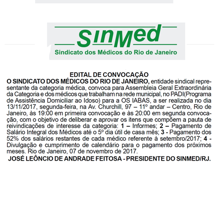 da Categoria e dos médicos que trabalham na rede municipal, no PADI(Programa de Assistência Domiciliar ao Idoso) para a OS IABAS, a ser realizada no dia 13/11/2017, segunda-feira, na Av. Churchill, 97 – 11º andar – Centro, Rio de Janeiro, às 19:00 em primeira convocação e às 20:00.