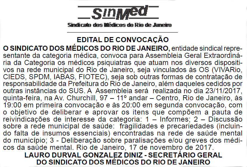 O SINDICATO DOS MÉDICOS DO RIO DE JANEIRO, entidade sindical representante da categoria médica, convoca para Assembleia Geral Extraordinária da Categoria os médicos psiquiatras que atuam nos diversos dispositivos na rede municipal do Rio de Janeiro, seja vinculados às OS (VIVARio,CIEDS, SPDM, IABAS, FIOTEC), seja sob outras formas de contratação de responsabilidade da Prefeitura do Rio de Janeiro, além daqueles cedidos por outras instâncias do SUS. A Assembleia será realizada no dia 23/11/2017, quinta-feira, na Av. Churchill, 97 – 11º andar – Centro, Rio de Janeiro, às 19:00 em primeira convocação e às 20:00 em segunda convocação.